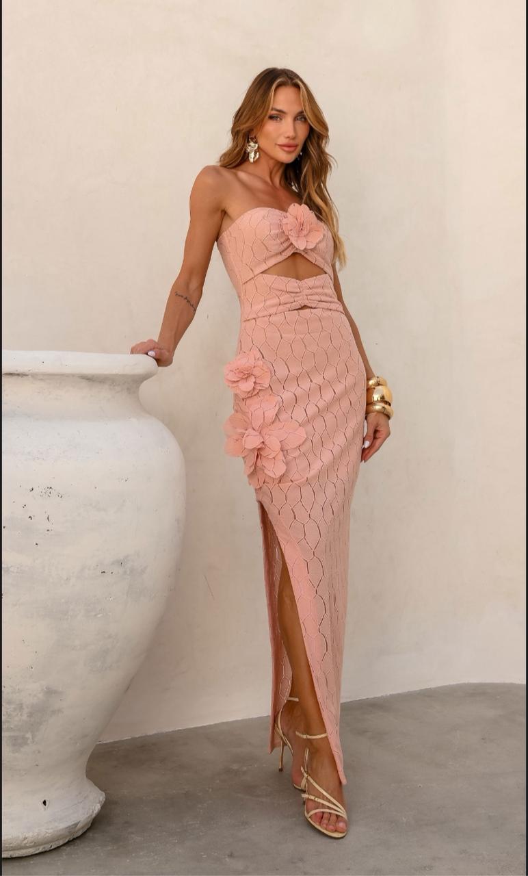 DESCRIÇÃO Vestido midi em renda floral aplicada PP | P | M | G Confeccionado em renda delicada com padrão orgânico e textura sofisticada, este vestido midi tra duz romantismo contemporâneo em cada detalhe. O busto estruturado é adornado por aplicações artesanais de flores 3D, que acrescentam feminilidade e sofisticação à peça. O recorte central fron tal, em formato triangular, traz um toque de sensualidade sutil e estratégica. O shape é ajustado ao corpo, valorizando a silhueta com elegância, enquanto a fenda lateral garante leveza e movimento ao caminhar. As flores aplicadas na lateral da saia completam a proposta visual com charme extra. Disponível em tons suaves, como azul serenity e rosa blush, é o vestido ideal para eventos ao entar decer, jantares especiais ou celebrações à beira-mar.